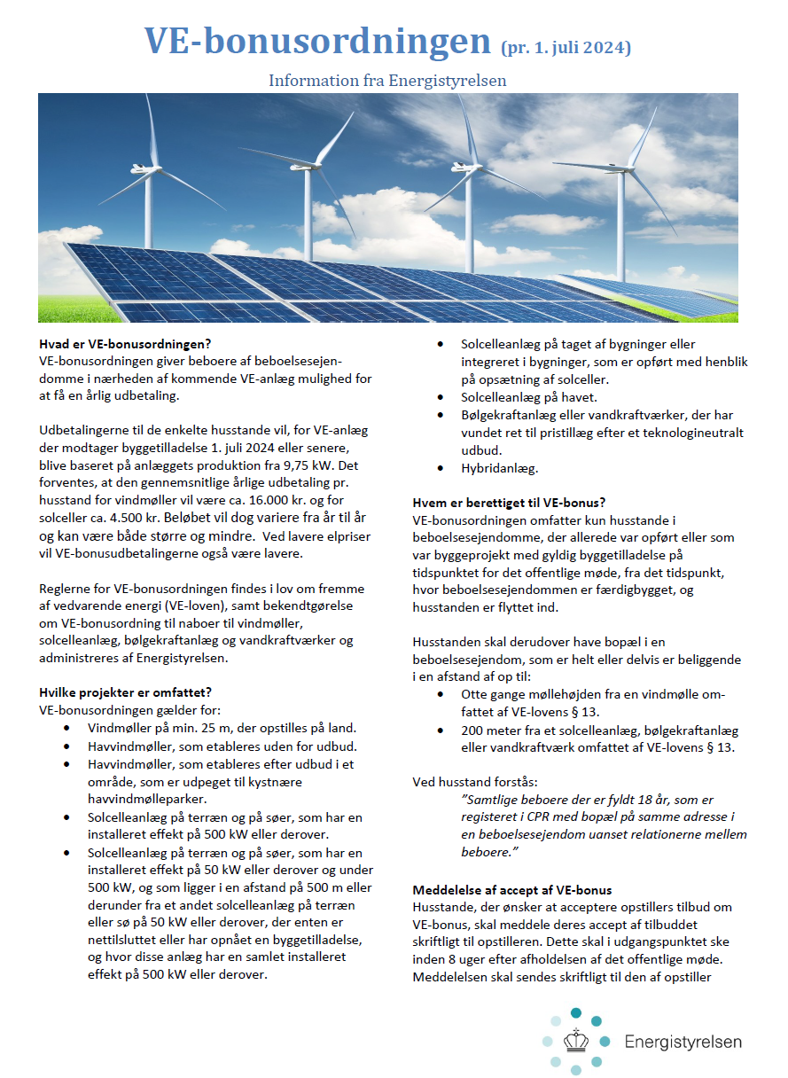 VE-bonusordningen giver beboere af beboelsesejendomme, som er beliggende i en afstand af op til 8 x vindmøllehøjden eller 200 meter fra nærmeste solcelleanlæg mulighed for at få en årlig skattefri udbetaling svarende til en del af anlæggets kapacitet i hele anlæggets levetid.
